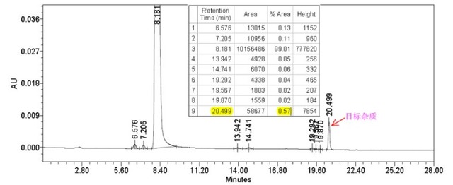 此圖為某原料藥純度檢測圖譜,要求:對 tR=20.49 min 的一個主要雜質(zhì)峰進行研究,首先通過制備分離到較純的雜質(zhì)單體(純度要求>98.5%), 再進行結(jié)構(gòu)解析。
