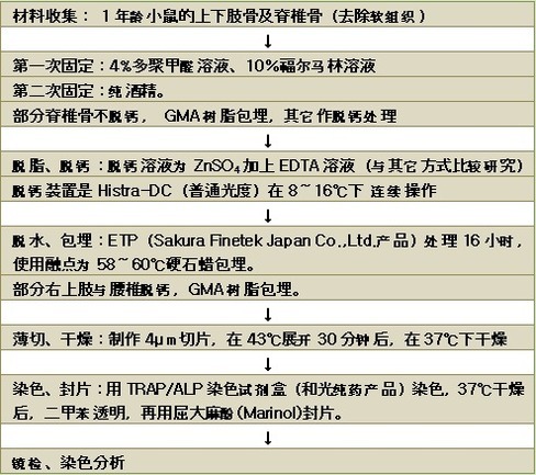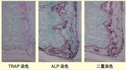 了解活體的骨代謝狀態是研究相關細胞生理活性的一個有效方法。對骨組織進行堿性磷酸酶(ALP)染色后可以了解成骨細胞的骨形成情況,對骨組織進行抗酒石酸酸性磷酸酶(TRAP)染色可以了解破骨細胞的骨吸收情況。若在同一切片上進行雙重染色就能同時了解兩者的情況。另外,它有一個優點是在脫鈣標本里,只要可以雙重染色,無需專用的設備,僅用一般的設備就可以方便地觀察到骨代謝。在此前提下,我們需要研究探討雙重染色的可行性。