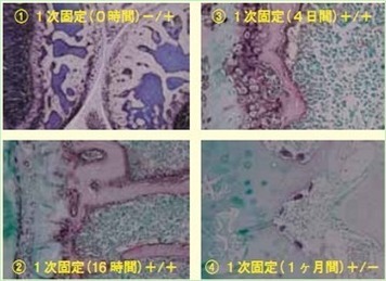 ALP是含有金屬(Zn)的蛋白。脫鈣作用會使Zn也一并被除去而導致酶失去活性。為了彌補這個缺點,加入硫酸鋅(ZnSO4),使ALP活化。每100ml的脫鈣溶液加入0.4ml 1%的ZnSO4 溶液,以補充Zn。并且,在作為脫鈣溶液檸檬酸鹽酸鹽緩沖液中添加Zn的同時,加入相同量螯合劑EDTA溶液的相關研究在進行中。也有研究在酸性脫鈣溶液(甲酸福爾馬林溶液)中的酶是否能反應。結果顯示脫鈣溶液與檸檬酸一樣,在EDTA溶液中能很好地染色。相反,在甲酸福爾馬林溶液中不能使酶染色(圖4)。此外脫鈣方法是用超聲波脫鈣裝置(Histra-DC,普通光度)在8-16℃的低溫下,連續操作3-6天,使樣品脫鈣。脫鈣后用甘氨酸與佛羅那 (Veronal)緩沖液(pH7.4)洗凈,用磷酸鈣在組織上吸附,防止沉淀。