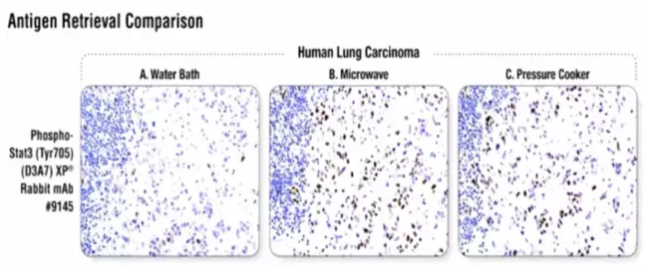 合適的修復(fù)液:根據(jù)抗體說明書使用合適的修復(fù)液。用檸檬酸修復(fù)后,切片需浸泡在修復(fù)液中,自然冷卻;而用 EDTA 修復(fù)后,切片可直接從修復(fù)缸中取出,直接進(jìn)行下一步。
