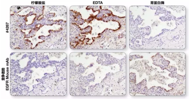 注:使用不同的修復(fù)方式和不同生產(chǎn)商的抗體檢測人肺癌組織中 EGFR 的表達(dá)。第一排為 CST 的 EGF Receptor (D38B1) XP? Rabbit mAb(#4267),EDTA 的修復(fù)方式明顯優(yōu)于檸檬酸鹽及胃蛋白酶,故在該抗體說明書中,標(biāo)注了使用 EDTA 修復(fù)進(jìn)行免疫組化實(shí)驗(yàn)。