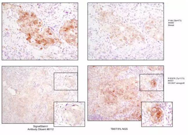 注:與#4060 在 TBST/5% NGS 中稀釋后所得的信號強(qiáng)度相比,經(jīng) SignalStain? 抗體稀釋液稀釋后的信號強(qiáng)度更強(qiáng);而對于#4407,選擇 TBST/5% NGS 作為抗體稀釋液的效果更好。