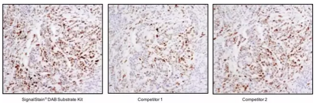 注:DAB 色原比較:在人乳腺癌組織中使用 p-Stat3(Tyr705)(D3A7)XP? Rabbit mAb#9145 檢測 p-Stat3 的表達(dá),使用不同的產(chǎn)品進(jìn)行顯色。與競爭者的 DAB 產(chǎn)生的信號相比,SignalStain? DABSubstrateKit 的顯色強(qiáng)度更佳。