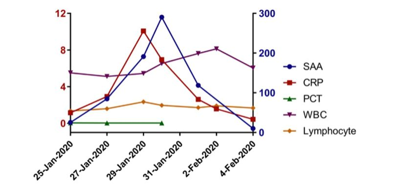 同時有研究表明,新冠病毒核酸陽性患者早期 SAA 明顯上升,積極治療后核酸復檢陰性,SAA 顯著下降并恢復正常。期間,PCT 和 WBC 結果一直正常與指南一致,CRP 雖有變化,但變化不明顯。