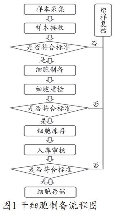 二、干細胞實驗室的功能設計干細胞的工作流程,如圖1所示,主要分為干細胞的制備、質檢及存儲。其中干細胞的質檢管理又包括無菌檢測、致病因子檢測、培養基殘余量檢查等。