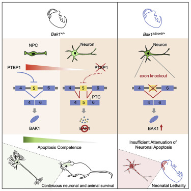 Zheng的研究小組現在報告說,這一機制的核心部分是Bak1基因序列的一小部分,Bak1是一種促凋亡基因,其激活可導致細胞凋亡。當一個被稱為微外顯子(microxon)的基因序列片段被拼接到最終的Bak1基因產物中時,Bak1的表達被關閉。外顯子是組成信使RNA的序列。