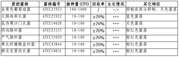 按標(biāo)簽用法制備培養(yǎng)基,接種以下質(zhì)控菌株,放置36±1℃需氧培養(yǎng)18-24小時(shí)。