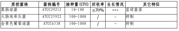 按標簽用法制備培養基,接種以下質控菌株,放置36±1℃需氧培養24-48小時。