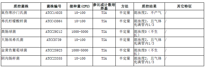 按標簽用法制備培養基,接種以下質控菌株,放置36±1℃需氧培養24-48小時。